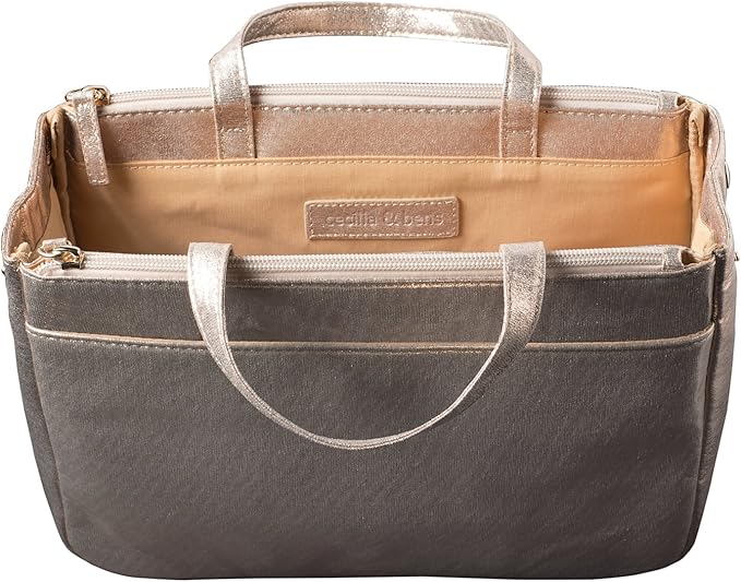 Der Handtaschen Organizer passt sich durch das leichte, weiche und strapazierfähige Material perfekt und ohne Rückstände an die jeweilige Handtasche an. Für das schnelle Umpacken von Tasche zu Tasche, hat der Organizer zwei Henkel die man leicht in das Hauptfach einknicken kann. Das Hauptfach verfügt über vier Stecktaschen, zwei Seitentaschen inkl. Reißverschluss und einer Außen-Seitentasche mit Magnetverschluss. Die Größe kann durch die an den Seiten angebrachten Druckknöpfen erweitert werden.